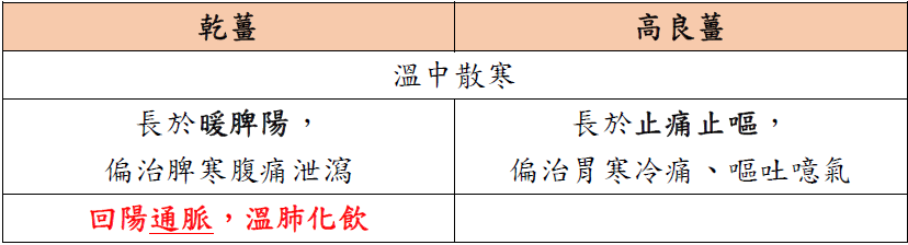 - 乾薑溫中、溫肺化飲之力較大,可回陽通脈,為亡陽證輔助用藥