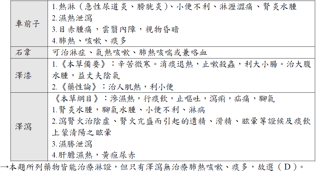 治療淋證兼見肺熱咳嗽、痰多者,下列何藥最不適宜選用? (A)車前子(B)石韋(C)澤漆(D)澤瀉 flashcard (D)