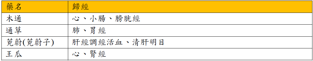 • 清熱利尿(木通較強):暑熱、濕熱所致小便赤澀不利,搭配滑石