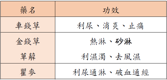 • 利尿通淋:熱淋、血淋、石淋小便淋瀝澀痛