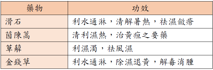 • 清熱利濕:濕熱並重,小便不利;濕熱陽黃、寒濕陰黃;風濕瘙癢 ,濕疹、口瘡